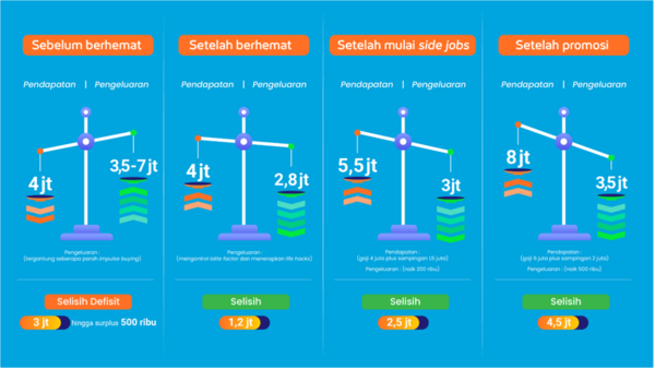 Kebiasaan berhemat otomatis bikin Rara gak gelap mata waktu gajinya naik. Sebagai ilustrasi, intip financial journey Rara secara singkat di bawah ini: